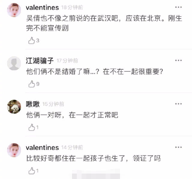 很多吃瓜群众对这两人的恋情瓜可能都吃懵了,反问道:“他俩一对呀,在一起才正常吧”“他们俩不是结婚了嘛?在不在一起很重要?”还有网友发出灵魂拷问:“比较好奇都住在一起,孩子也生了,领证了吗?”这个问题当然得由两位正主做出回答。