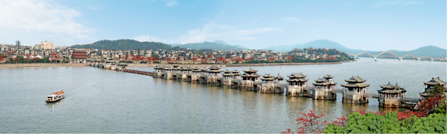 广济桥在桥梁设计上也有自己的独特之处,桥的东西两端是用亭台楼阁连接的阁桥,中间却是用十八艘渔船连接的浮桥,形成“十八梭船廿四洲”格局。平常连接上可以通车马,将浮桥的小船开走又可以通航运。