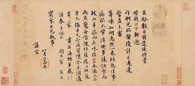 释文:襄启:数日前遣使持书棨戟之下,辄邀行舸光临弊境,计已通 达当直,未审尊怀如何?惠然一来,殊为佳事。病躯不常得安,多 缘饮食而致。山羊涩而无味,虽食不过三二两,鱼鳖每食便作腹疾, 以此气力不强,日久必须习惯,今未凋适耳。蒙书并海物,多感多 感! 谨奉手启上闻。不宣。襄上,宾客七兄执事。八月二十四日。谨空。
