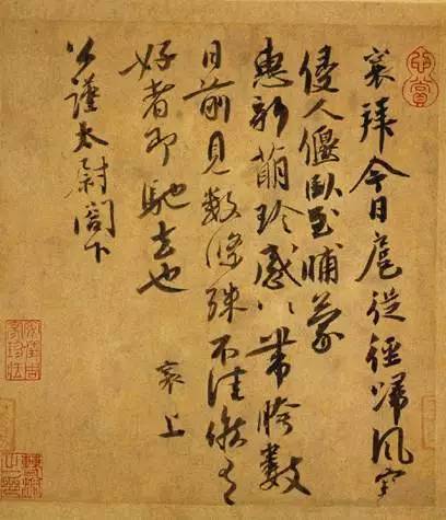 释文:襄拜:今日扈从迳归,风寒侵人,偃卧至晡。蒙惠新萌,珍感 珍感!带胯数日前见数条,殊不佳。候有好者,即驰去也。襄上公 谨太尉阁下。