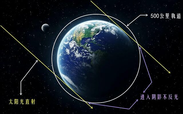 我看了一下部署计划,利用三颗500公里高的低轨卫星,轮流为同一地区照明。问题是500公里的低轨卫星晚上不是大部分时间都在地球的阴影里吗?怎么给城市照明?500公里低地球轨道,比空间站(400公里轨道)稍高一点,估计2小时左右绕地球一圈。
