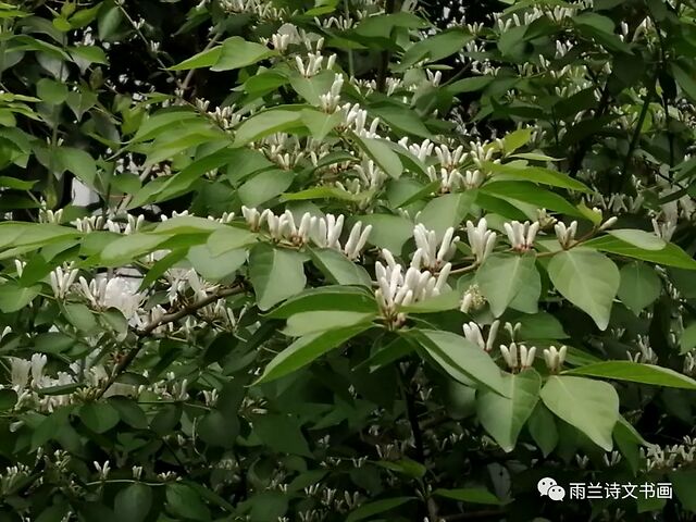 金银木的花朵比较小巧,花朵也是繁密的。金银木花盛开的时节,远远望去,一层层的绿叶,一层层的白色灯盏,纵横交织,层层叠叠,特别富有层次的美,也特别富有意趣。