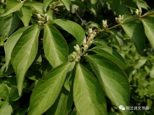 金银木的叶子是对生,这是比较常见的,有趣的是,金银木的花蕾更也是对生,花蕾从每片叶子的叶腋里冒出,每个叶腋里冒出两个细细的圆柱状的花蕾,两片绿色的叶子相对,两个花蕾,则是两两相对,相映成趣。