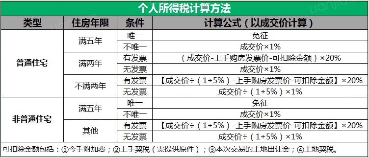 转让家庭名下满五年且唯住宅的,免征个人所得税;不满五年或者不唯一,按全额1%或者差额20%计征。具体计算方法如下。