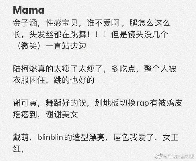 录制结束后大家讨论最多的当属《MAMA》的两组舞台,其中A组更是被评价为全员实力在线。从网友repo来看,陆柯燃不仅妆容抢眼,笔直的大长腿更是格外吸睛,和金子涵的默契配合让不少人大呼看出了cp感。