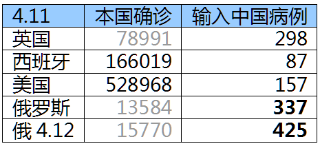 俄罗斯到11日才确诊13584人,12日增加了近2200人,也才15770人。规模与美国、西班牙、英国相去甚远,但对华输出病例却远超美、英、西。