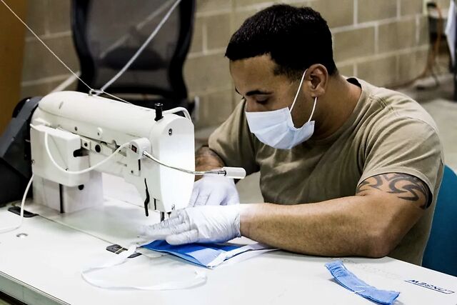此前,为了解决防疫物资短缺,美国军队开始自制口罩: