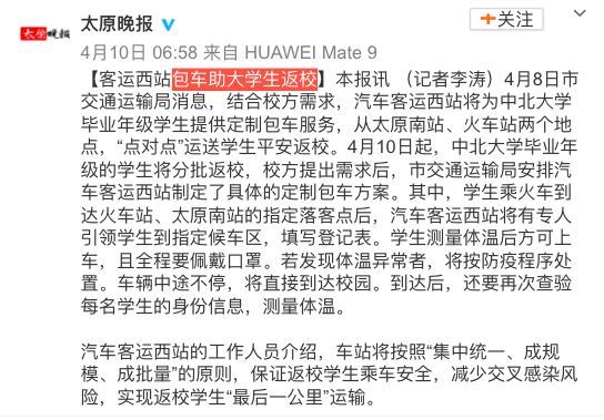 为降低学生们旅途中的健康风险,太原理工大学与铁路部门制定“点对点”方案,为省内乘坐火车返校的同学集中购票,设立学生专门车厢,到站后经过核验身份、测量体温、行李消杀等工作,再乘校车集中到校。