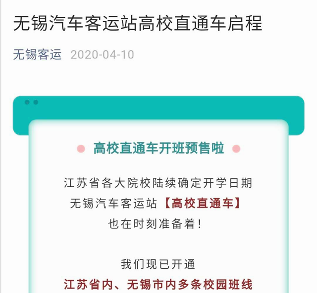 比如,无锡汽车客运站开通江苏省内、无锡市内多条校园班线,满足高校学生返校出行需求。