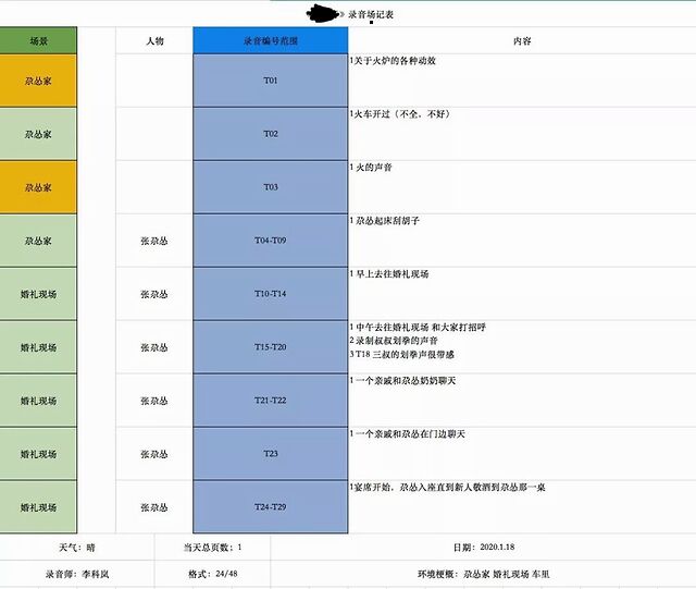 李科岚:场记表是其实是一个非常重要的案头工作,虽然说我们现在拍纪录片的时候,我们都使用时间码的校对流程,其实像以前一边看场记表,一边校对的工作,现在是很难见到的。但是同样的一个问题是,纪录片的拍摄素材量是相当巨大的。剪辑师在剪辑的时候如何快速的去检索他所需要的段落和素材,我们在前期给予他的场记表就起到了至关重要的作用。现在我所记录的场记表可能跟影视剧的场记表有不同,因为影视剧的场记表他是以条为单位的,就是以数单个素材为单位,记录了这是哪一在剧本里面是哪一场,哪一进多少号,然后记录了台词的内容。然后还会记录,如果使用多个无线话筒,会记录哪个无线话筒,录的是哪一个演员的声音。但纪录片的场记表其实跟后期的老师沟通的时候,其实没有必要这么麻烦。它的作用是当他需要分场景去检索拍摄内容的时候,我这个场记表可以非常快速清晰地帮助到他。现在的场记表就是以场景为单位,比如我们今天到了某某某地,这个地点是哪里,然后人物是哪一些,然后第一件事发生了什么事,或者他说了哪些非常重要的话,然后备注,然后写上时间和天气。