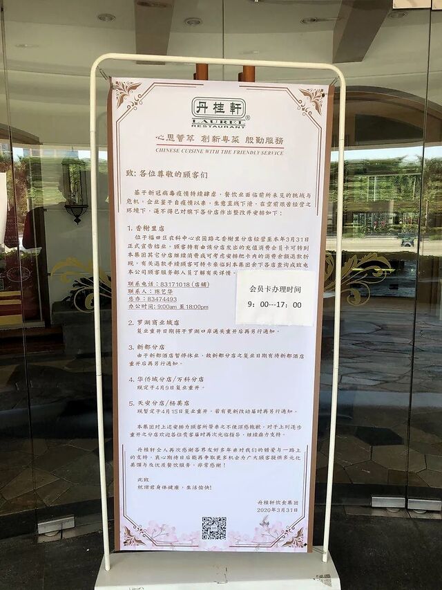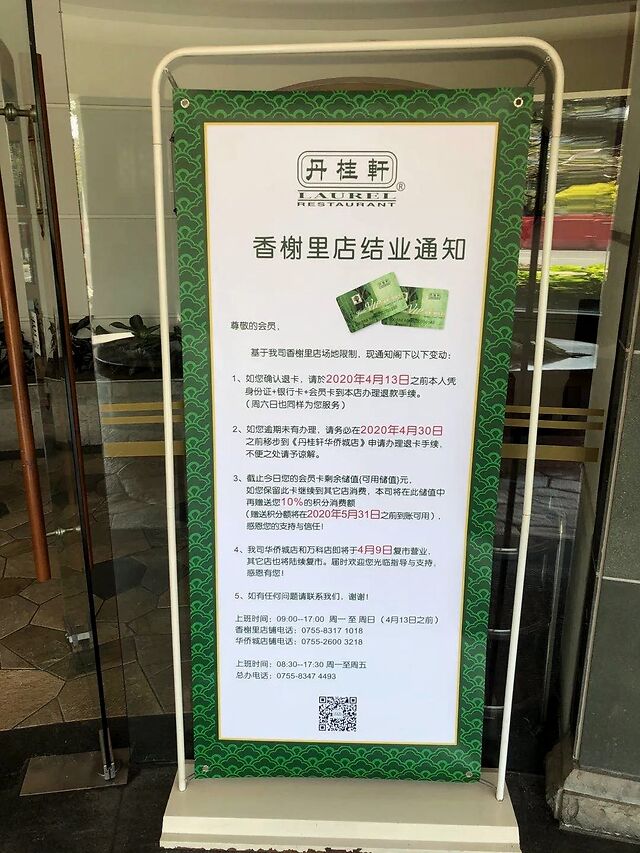 目前,丹桂轩在深圳的7家门店,结业一家,华侨城店和万科分店,已于4月9日复工,天安分店和杨美分店也将于4月15日复工,而罗湖商业城店和新都分店,则复工时间未定。