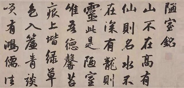 泰不华篆书作品欣赏《陋室铭》卷,纸本,纵36.9cm,横113.5cm。1346年43岁时作,书法兼善篆、隶、楷。篆法师宋徐铉,下笔多用方折,行笔圆活遒劲,结构疏朗工稳,末笔多作尖锋,即“悬针”笔法。此为迄今所见泰不华唯一的篆书真迹。作为一个少数民族文人,能写如此齐整秀逸的汉字古体实属难能可贵。