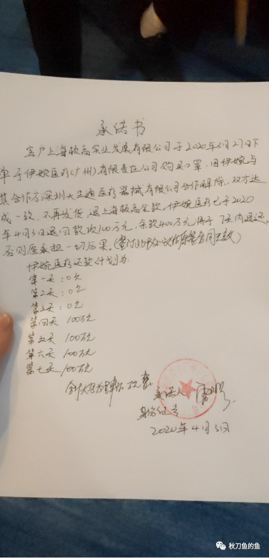 时至4月3日上海顿高实业经多方交涉,雷盛洪最终同意通过伊婉公账退款100万元,当晚写下退款承诺,在7天内还完400万货款,并签字盖章。