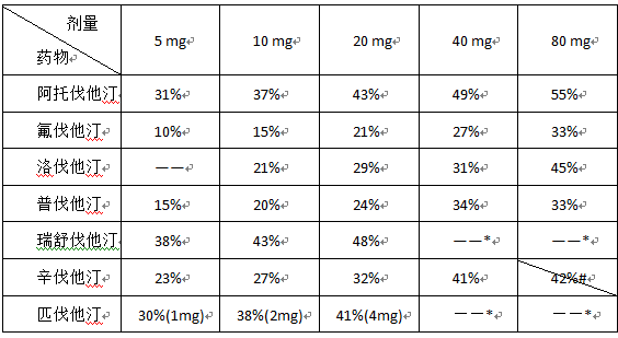 常用降脂药物降低LDL-C程度与服用剂量的关系(不同研究统计可能存在一定差异,仅供参考)