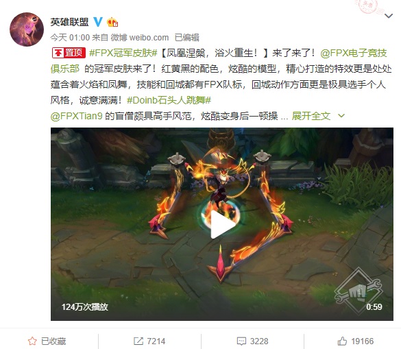 英雄联盟@FPX电子竞技俱乐部 的冠军皮肤来了!红黄黑的配色,炫酷的模型,精心打造的特效更是处处蕴含着火焰和凤舞,技能和回城都有FPX队标,回城动作方面更是极具选手个人风格,诚意满满!#Doinb石头人跳舞#