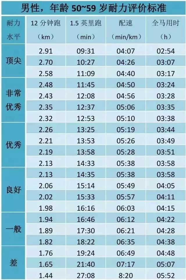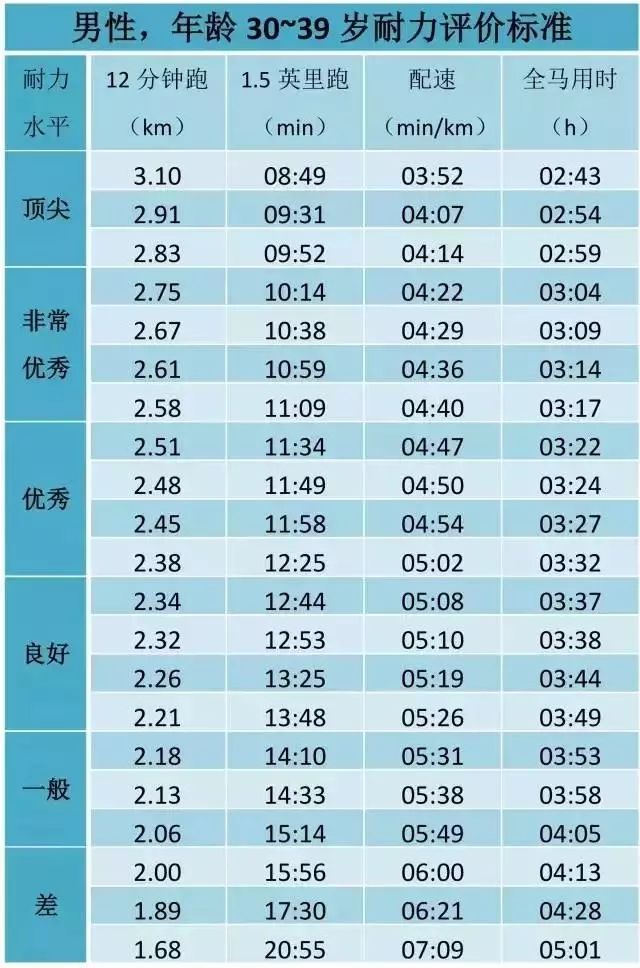 基于这一点全球最专业权威的、有氧运动之父——美国军医库伯提出了一套国际标准耐力评价表:12分钟跑步配速测试。