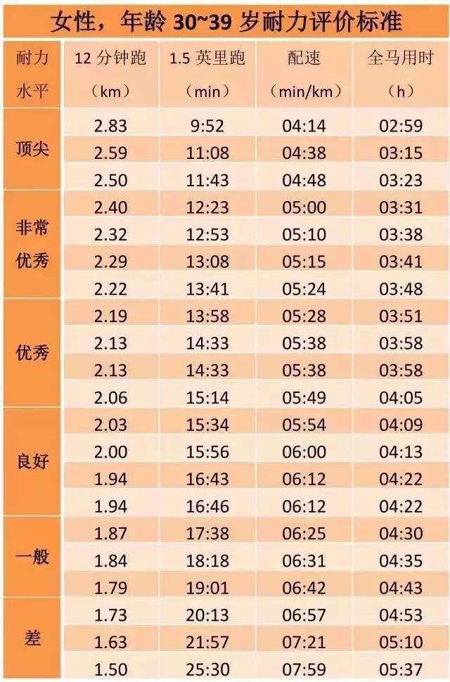 注:国际耐力标准,与大多中国人相比可能偏高。参考上表比照自身时,可允许略微降低相关数据的标准。
