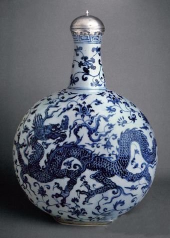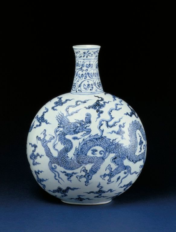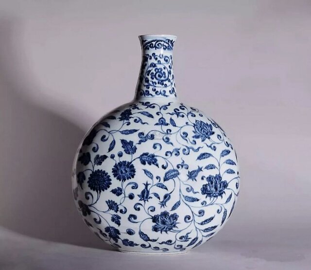 永乐年间中国与西方的贸易得到恢复,来自伊斯兰世界的影响在陶瓷器器形上的体现变多,而且西亚的优质钴料再度进口,使得青花的发色较前更为浓艳。这件扁壶就是当时出现的诸多新器形里的一种。