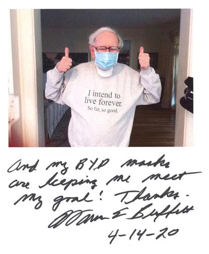 巴菲特称,“我的目标是长命百岁,目前为止进展还不错。而现在,比亚迪口罩更是助我一臂之力!谢谢!”---沃伦·巴菲特,2020年4月14日
