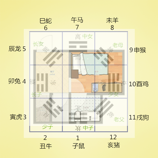 这样,如果我们有户型图,就可以画上九宫八卦图,并且将1-12个数字分布上去。