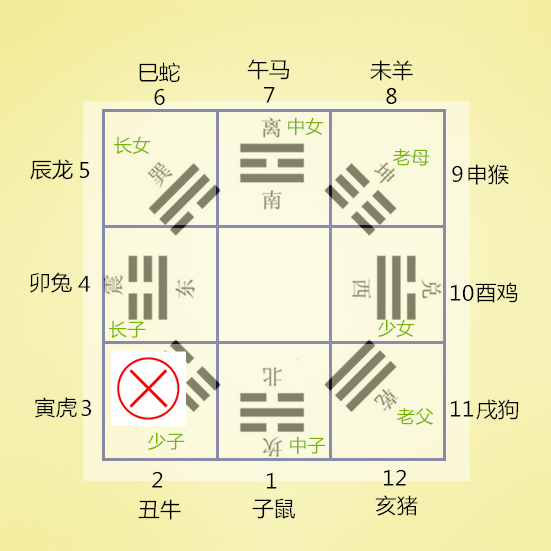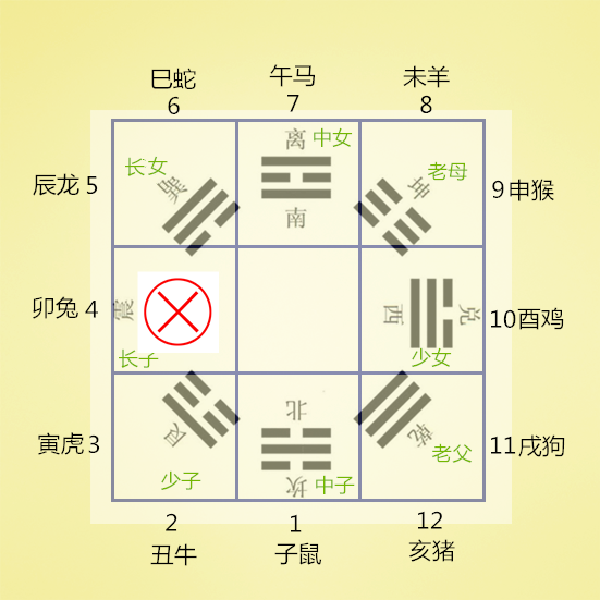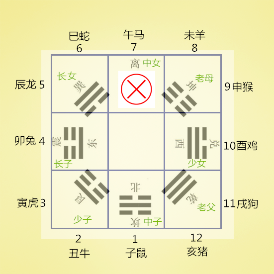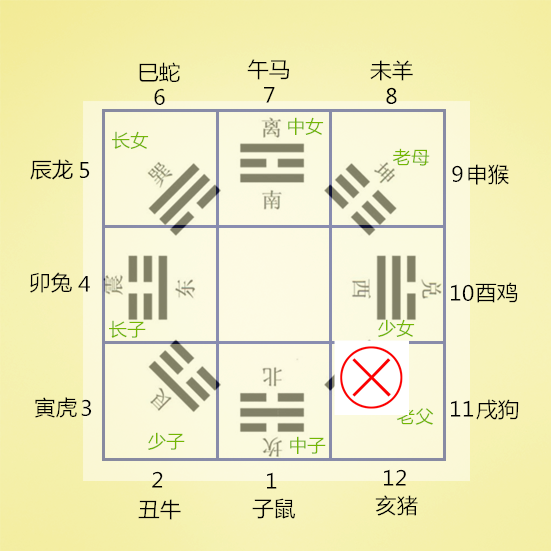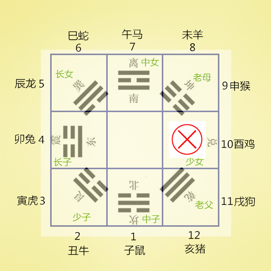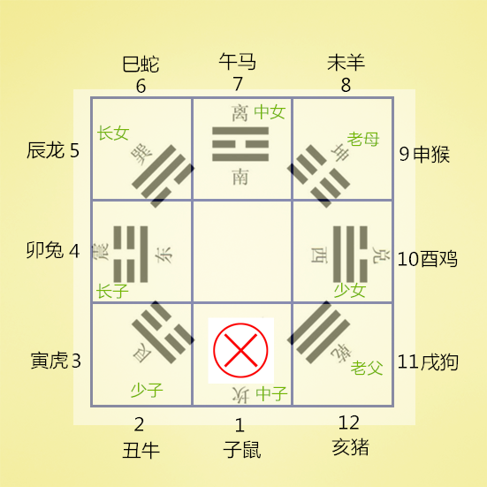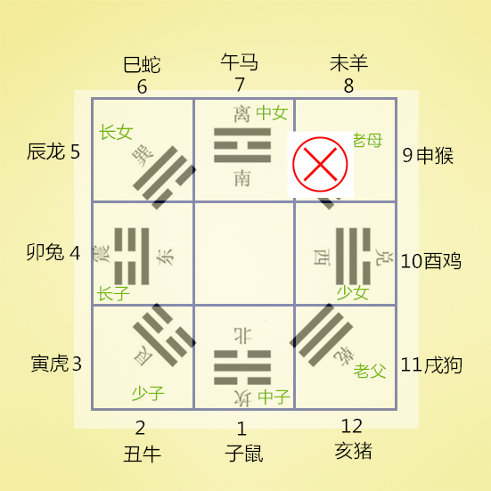 将十二地支的1—12个数字对应放上去,就回到了前面的知识点了,1-12分布八宫的情况就如下图: