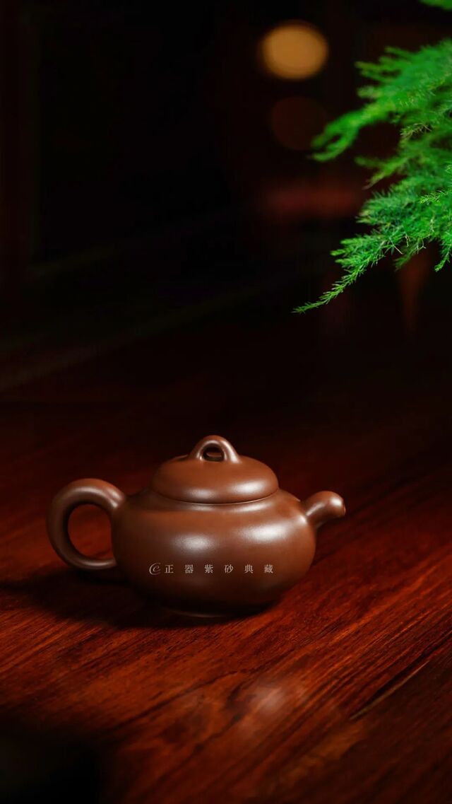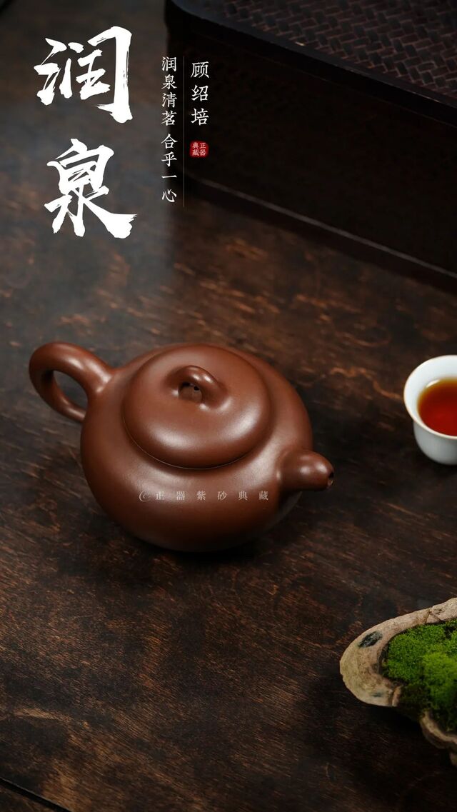 润泉壶为顾绍培所抟制,由原矿紫泥制成,设计精巧, 质感绵密厚重,玉润珠圆,将光器的特点诠释到极致 。