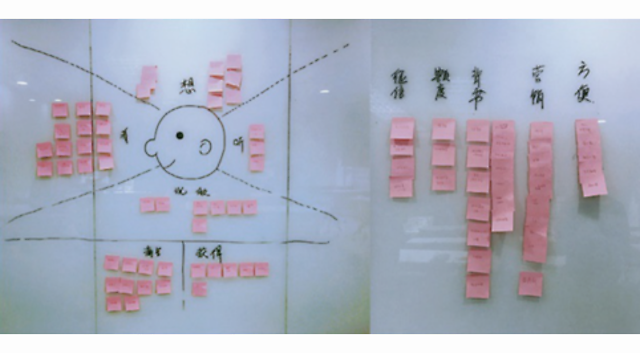 4. 成员先各自思考,然后在便签中写下自己的想法,一边将便签帖在合适的位置上一边解释讨论、探索它的痛点和收获的细节。把便签分类、提炼,得到解决问题的方向。最后给5分钟的总结分享。