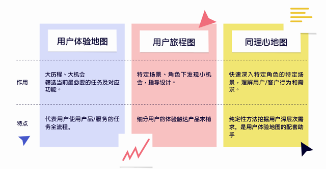 那说到这里,有的人会提出:用户体验地图、用户旅程图、同理心地图,它们的区别是什么?在这里简单以这个表做下区分: