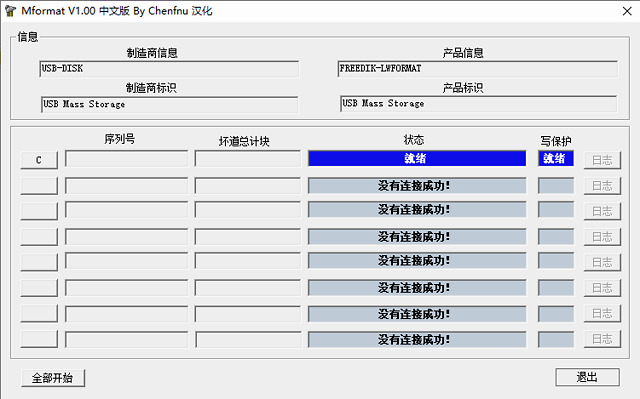 这款工具会自动识别U盘信息,选择U盘之后点击“全部开始”即可。