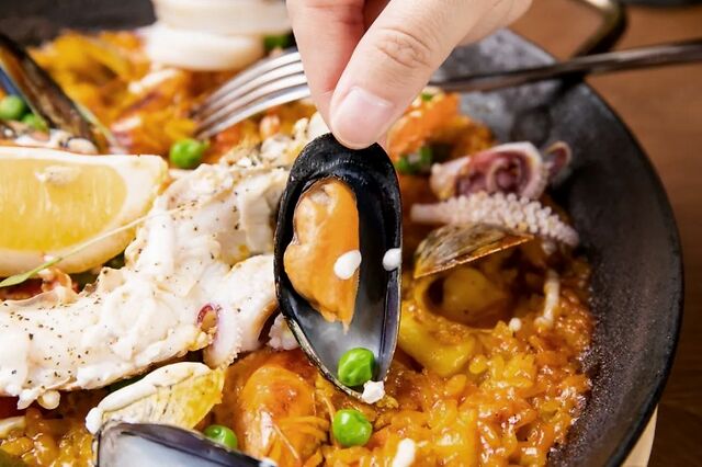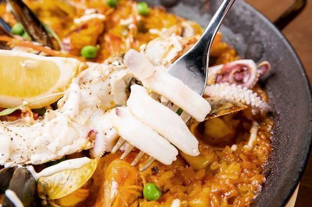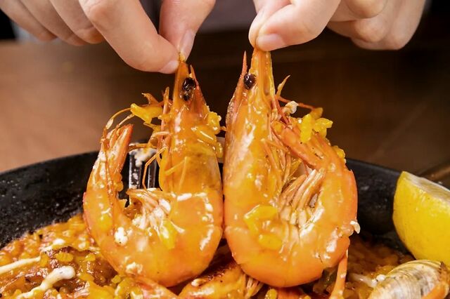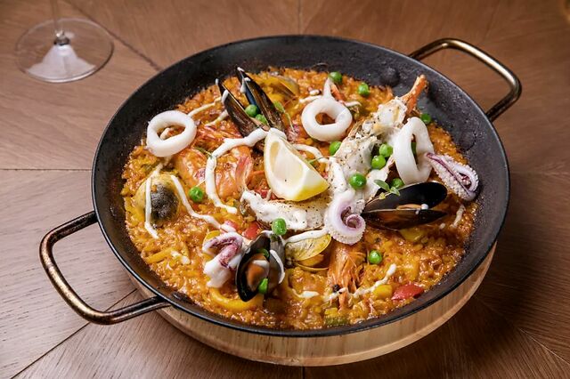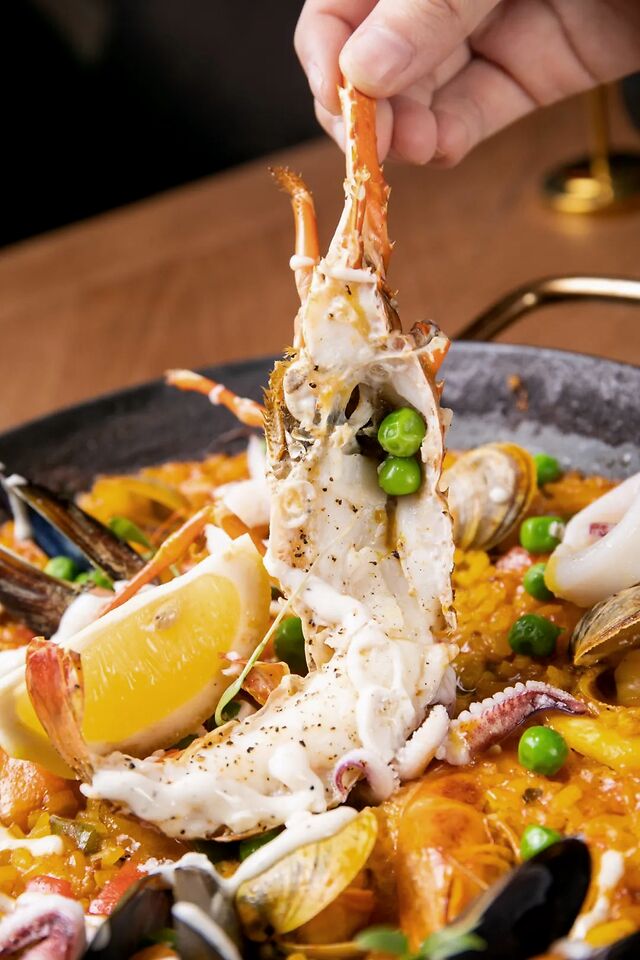 西班牙海鲜饭将鸡肉、大虾、鱿鱼、贝壳混合,还有半只小青龙在上面,分量超级足, 每一口都是地地道道的西班牙风味。