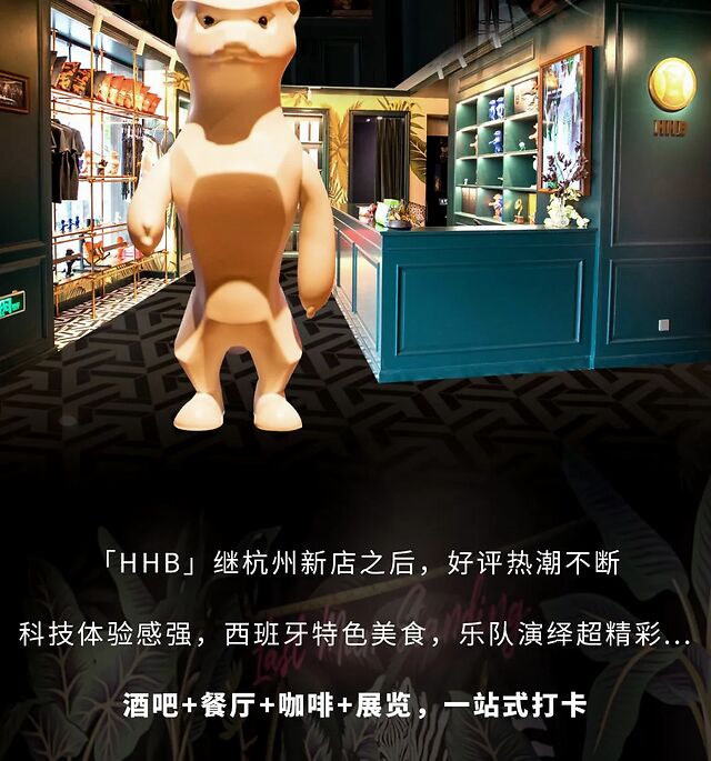 玩翻新概念的HHB酒吧, 1000+ ㎡超大三种空间,黑科技、多媒体艺术、顶级音乐、西班牙美食. ..等多种亮点,集酒吧、餐厅、咖啡于一体!简直是科技感满满体验感超强的主题乐园,必将成为业界潮流风向标!