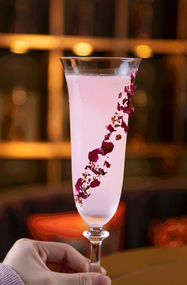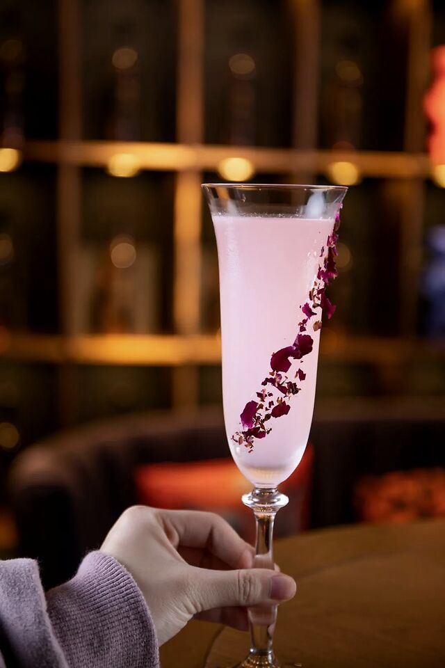 口感不会太烈,伏特加与冰粉红组合十分融洽。玫瑰花瓣在杯子上显得俏皮可爱,喝上一口清淡爽口,微微甜。