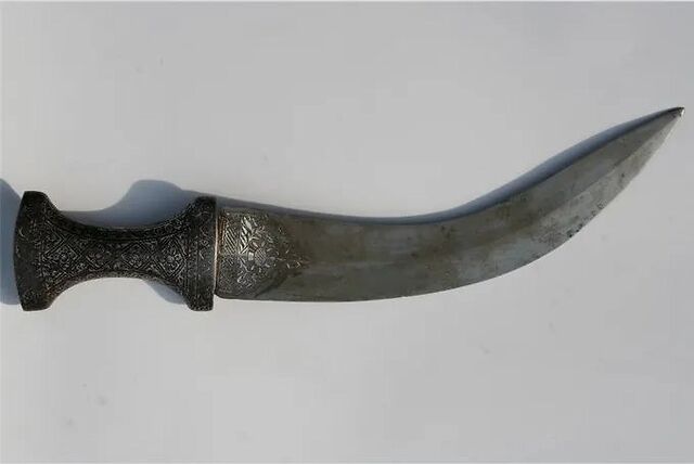 这把刀用银饰镶嵌雕刻,描绘了两个孔雀,经过辨别,是卡扎尔的产物。