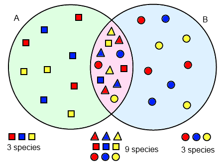 So, while ecosystems A and B each contains three species, the overlapping transition zone contains nine.