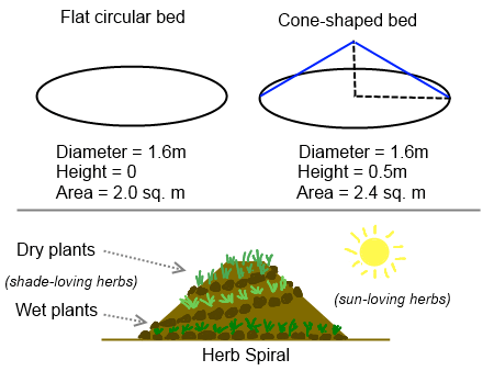 使用这个尺寸,我们可以看到一个简单的圆形床面积有2.0平方米,但是如果我们创建一个0.5米高的土丘,我们现在可用的面积增加到2.4米。这意味着面积增加了20% 。螺旋越高(在合理范围内) ,我们获得的额外面积就越多。