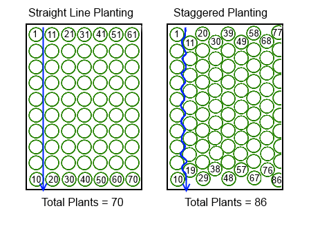 圆圈表示为每个植物分配的空间,因此两种情况下植物之间保持相同的距离。如果一个圆圈是15厘米(6英寸)宽,那么两种植物之间的距离总是这样。当我们改变种植安排从直线到’波浪’ ,我们可以增加数量的植物在我们的花园床在这个例子从70到86。