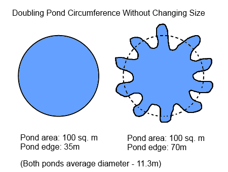 We can replicate this pattern in our designs to maximize the available edge. If we are building a pond for example, without changing the size of the pond, we can double the length of the edge (the earth/water interface), and therefore squeeze in twice as much productive plants around it. In the example below the mathematical calculations show how for a pond based on n 11.3m circle, we create 100 square metres for water surface, and by changing the edge from a straight one to a wavy, we can double the effective circumference.