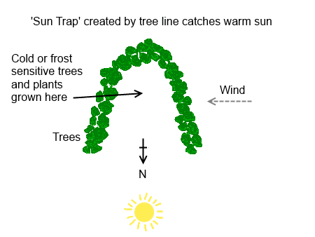 A ‘sun-trap’ can be made using sharply curved boundaries to protect plants from the wind and maximise heat. “太阳陷阱”可以利用明显弯曲的边界来保护植物免受风的侵害并最大限度地提高热量