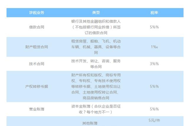印花税嘛,没啥好说的,涉及到以下业务的都要交,不同业务类型对应不同税率,下面都列出来啦。