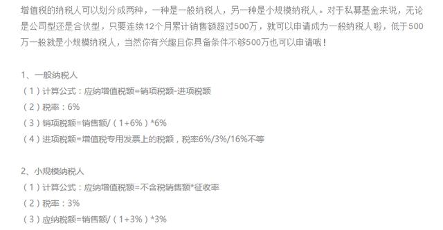 至于基金管理人本身的收入缴纳的增值税,其实跟前面私募基金的增值税基本是一样的啦,都是区分一般纳税人和小规模纳税人,针对贷款服务、金融收费服务、金融商品转让等涉税业务类型缴纳增值税,计算方法跟前面的都是一个样,还有“一税两费”、印花税、企业所得税、个人所得税等等,都没啥太大区别了,在这里就不重复啦。