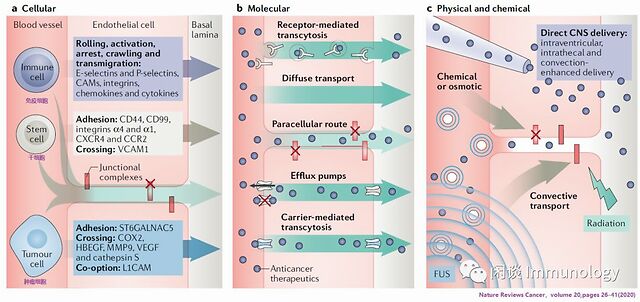 脑转移的肿瘤细胞通过一系列酶来破坏BBB的完整性,黏附爬行通过。