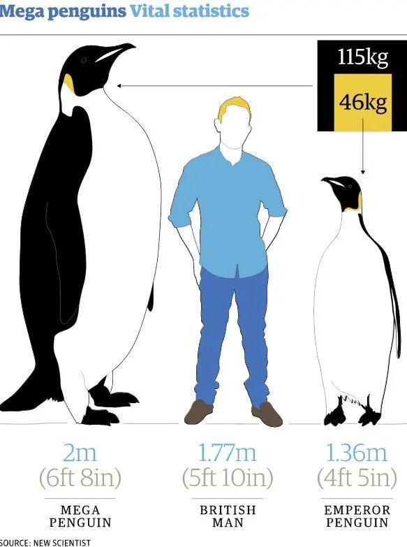 科学家按现代企鹅的骨骼比例推测了这种企鹅的完整体型。据估计这种鸟类体重约250磅——也和勒布朗詹姆士差不多。而现代最大的企鹅——帝企鹅——身高仅1.2米,体重一般不超过100磅。