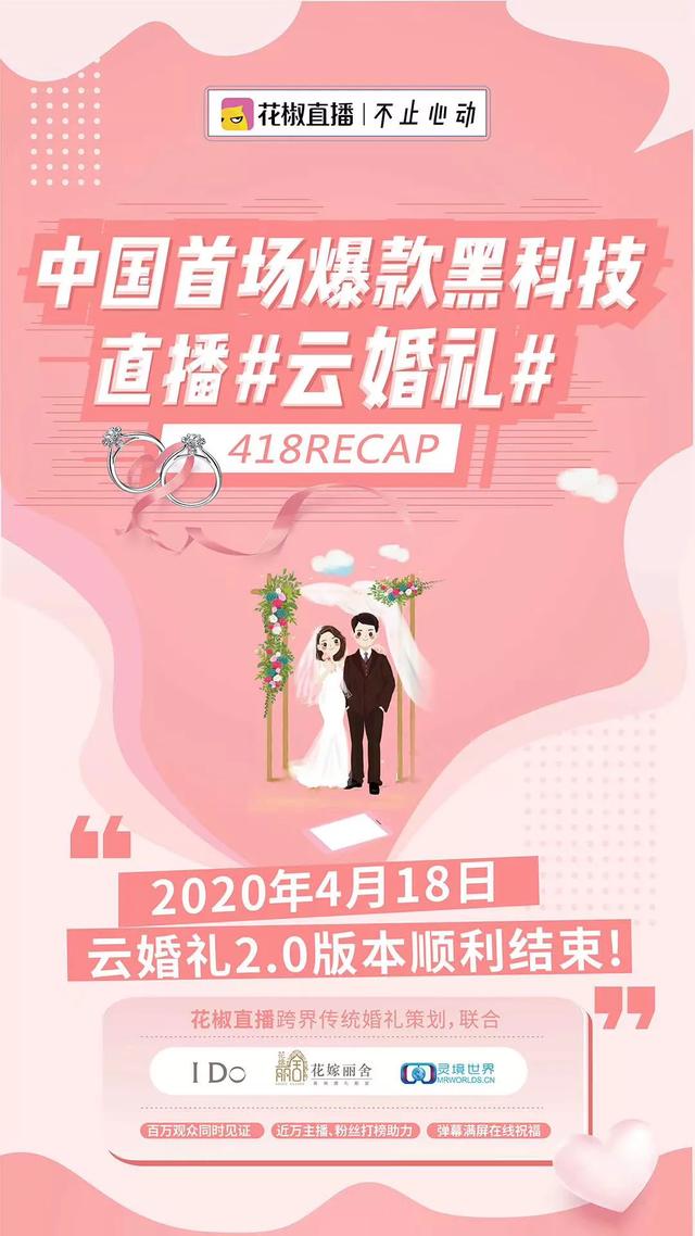 婚礼是一个人生命中最为重要的时刻,一场隆重的婚礼不仅是爱情的见证,也会带来很多亲友的祝福。很多地方甚至会因为比拼婚礼的规模造成很多铺张浪费,你三十桌,我九十桌,但即便如此,也只是几百人的规模。如果说一场婚礼能有几十万甚至上百万的观看,你一定会想这必然是一个明星的婚礼,但实际上,普通人的婚礼一样可以盛大而隆重,而花椒直播刚刚结束的一场“云婚礼”,无疑是打开了一扇新时代婚礼的大门。