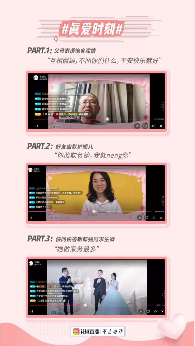 即便如此,爱情不会停止,结婚也不会停止,只是没有办法举办的婚礼却让人难免有些遗憾,似乎让这份爱情无法得到见证和祝福。那么在直播兴起的当下,我们有云看房、云蹦迪,能不能把婚礼也搬到云上呢?能不能让婚礼也变成直播的婚礼呢?在花椒直播上,我们看到了这个伟大的创举和突破。