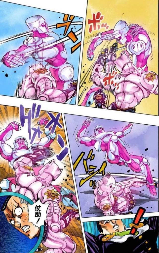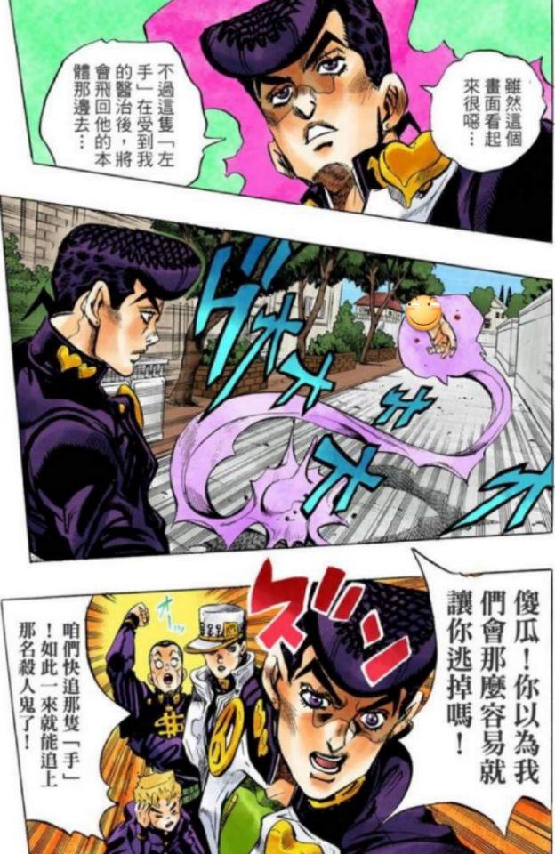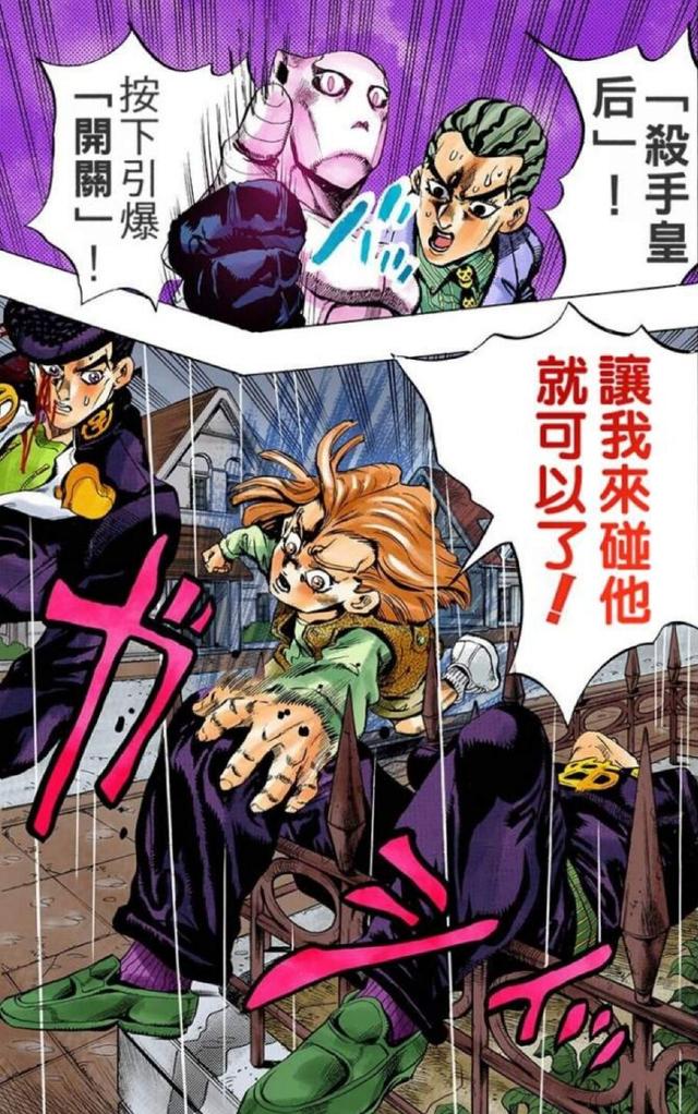 正因如此,仗助必须尽量避免和吉良吉影的双手接触,以免被杀手皇后的能力变成炸弹。只要让吉良吉影的断手寻找本体,就算吉良的手复原了,他也碰不到仗助,毕竟论近战肉搏能力,杀手皇后可是远不如疯狂钻石的,这点从最终战就能看出来了。