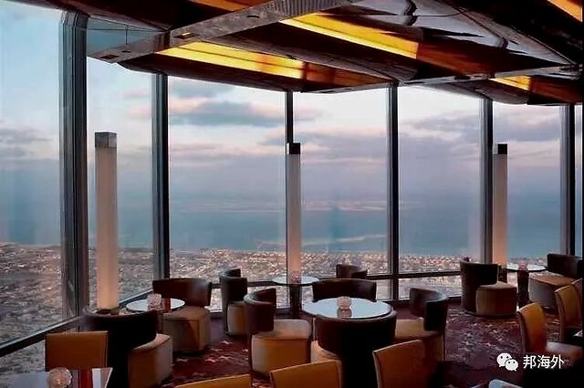 At.mosphere餐厅位于离地442米的高空中,是世界最高的餐厅。餐厅坐落于世界第一高楼——哈利法塔(Burj Khalifa)的第122层。在这家餐厅的休闲吧一边享用点心,一边欣赏夕阳美景再适合不过。