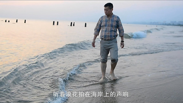 傍晚,阳光渐渐消失在蔚蓝色之中,吴锡龙漫步在细软的沙滩上,听着浪花拍在海岸上的声响,身后的脚印也越来越长。惊涛骇浪让人心生敬畏之情。