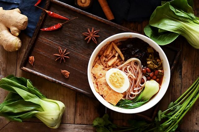 东北人开始对米线进行本土化改造。首先,舍弃了过桥米线那些繁琐的小碟子,将米线、青菜、豆皮丝烩于一碗,出现类似于拉面的“减配版”米线,再搭配肉酱或是辣肉酱等浇头食用。