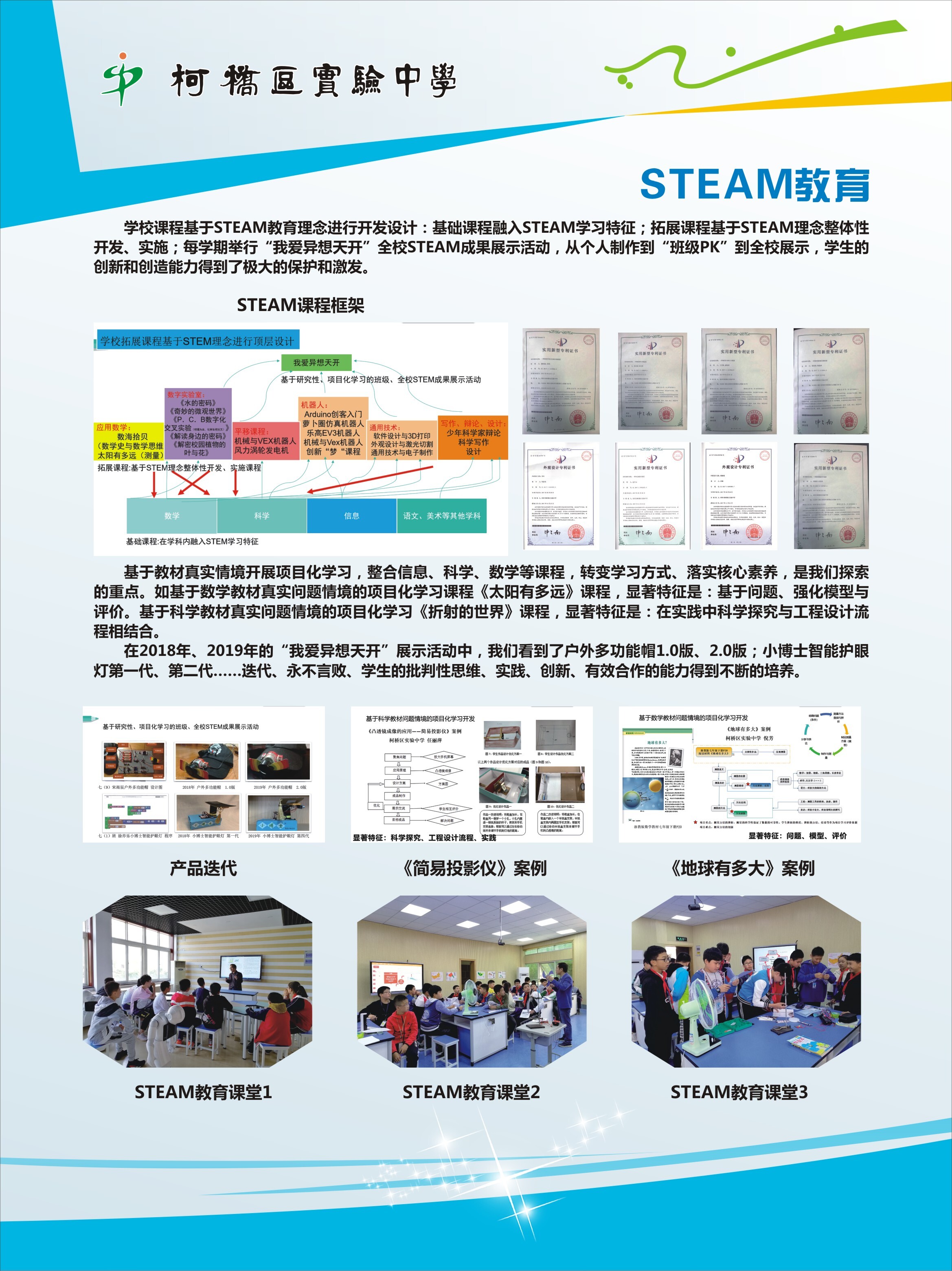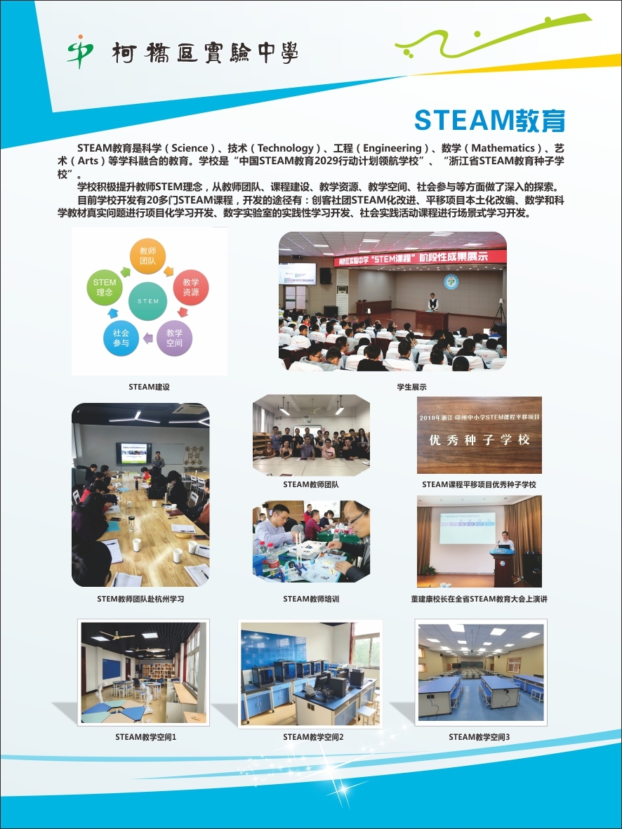 学校是中国STEAM教育“2029行动计划”领航学校、浙江省STEM教育种子学校,在绍兴市内率先开展STEM教育。目前,学校从教师团队、课程建设、教学资源、教学空间、社会参与等方面深入探索。课程基于STEM理念设计,基础性课程融入STEM学习特征,拓展课程基于STEM理念整体性开发实施,每学期举行“我爱异想天开”STEM成果大型展示活动,个人制作、班级PK、全校性展示,激发学生的创新能力。近三年,学校已出版三本《我爱“异想天开”——学生创新成果集》,33项优秀作品获得了国家发明专利,多次承办省、市STEM研讨活动,学校STEM实践团队获得了“2019年浙江省中小学STEM课程——《风力涡轮机挑战》平移项目跟进实验‘最佳团队奖’”。