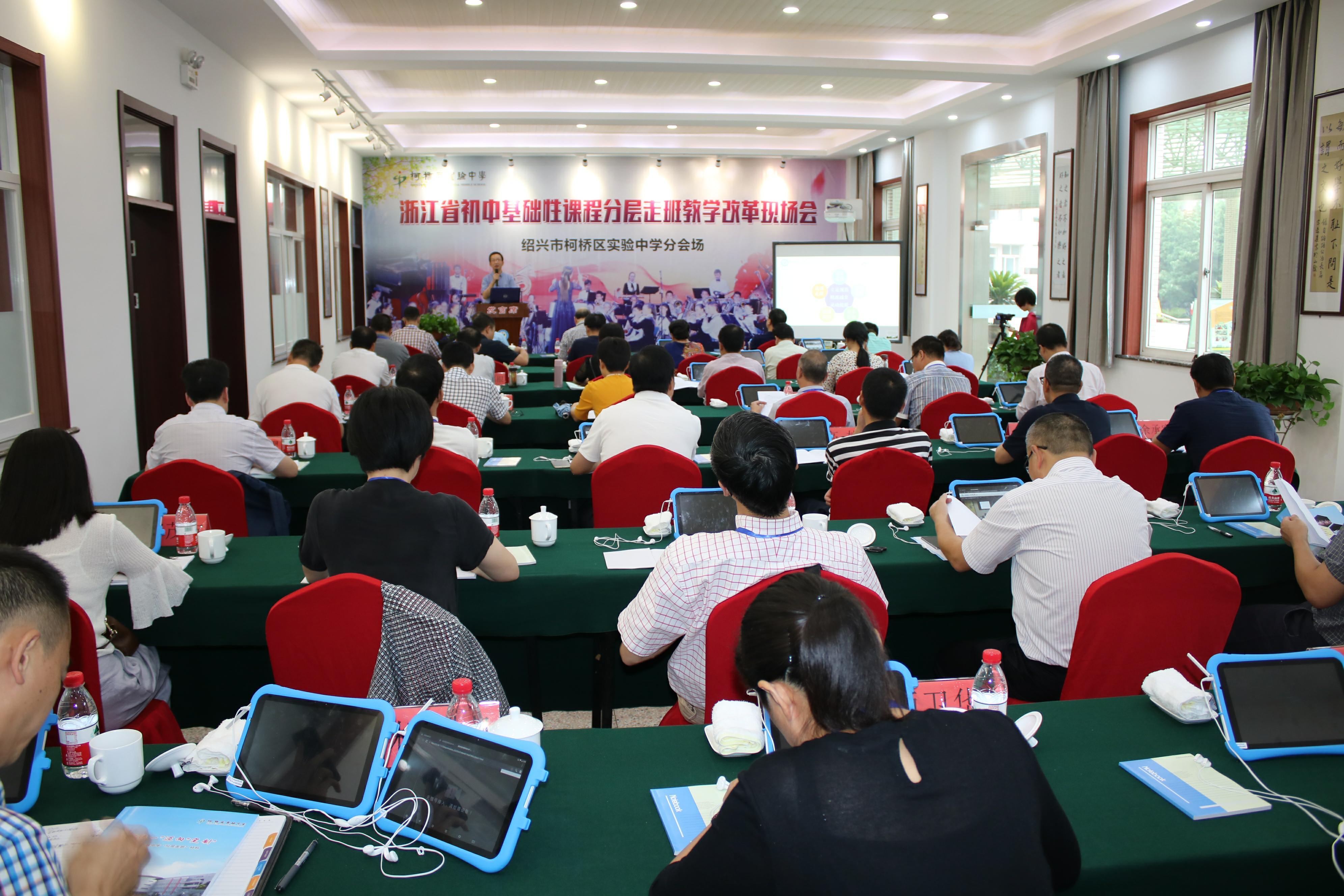 “分层走班”教学是让学生选择适合自己的课堂。课堂分层、作业分层、评价分层,都要建立在尊重每一位学生的选择、适切并促进每一位学生发展的基础上。不同层次的课堂,教学设计、教学策略、教学方法、课堂结构、师生反馈、配套作业等也不同,以学定教,满足学生的差异化需求。“异”中也有“同”,如 A层、B层单元测试试卷中50%的题目完全相同。另外50%的题目两者的素材也基本相同,只是B层加大了问题的思维含量。2007年至今,学校连续11年承担全省性课堂教学观摩活动——“鉴湖之春”。2017年,浙江省基础性课程“分层走班”教学改革现场会课堂观摩活动曾在学校举行。目前,学校是“绍兴市品质课堂研究项目基地校”,两个“分层走班”省教育规划课题已顺利结题。